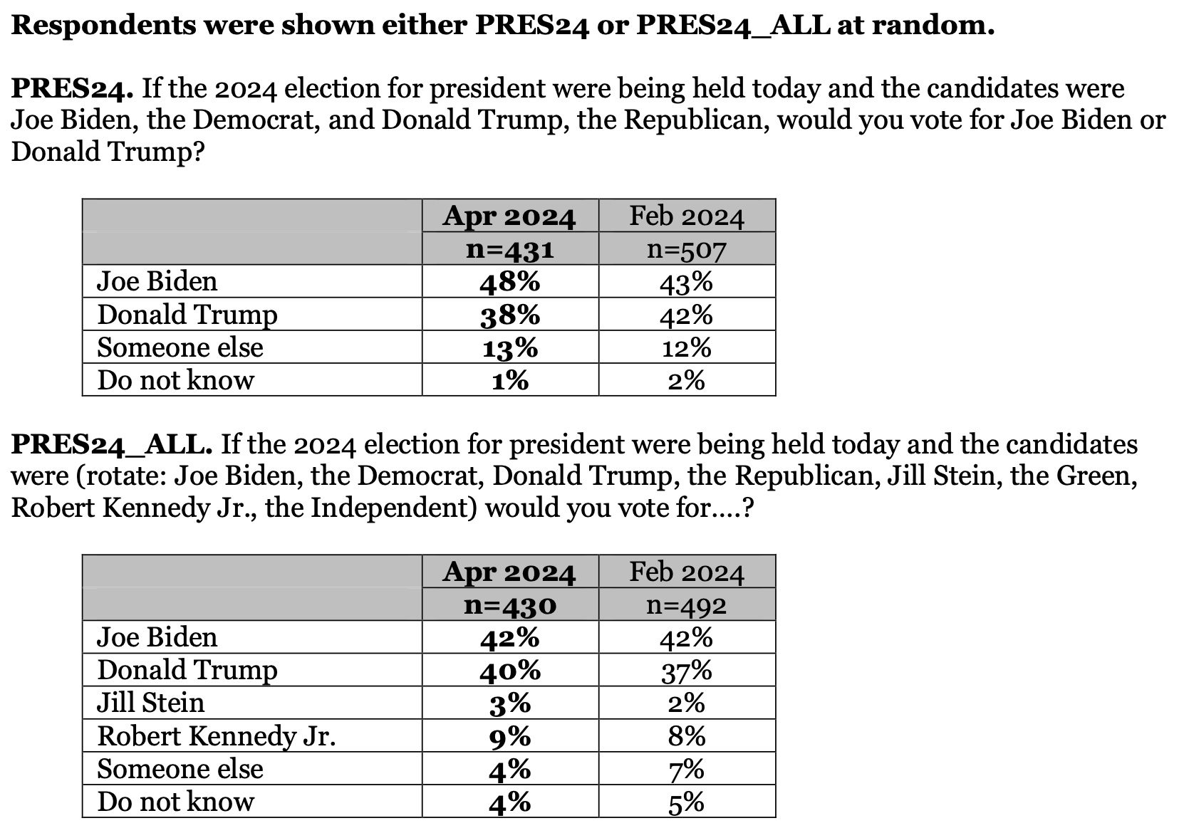 In February, Trump was 5 points behind Biden in the multi-candidate experiment, appearing to lose that share to some combination of Stein and Kennedy, "Someone else", and "Don't Know". In the February multi-candidate experiment, the number of people saying "Don't Know" was twice as large as the head-to-head; those choosing "someone else" in the head-to-head appear to choose Kennedy or Stein in the multi-candidate experiment.