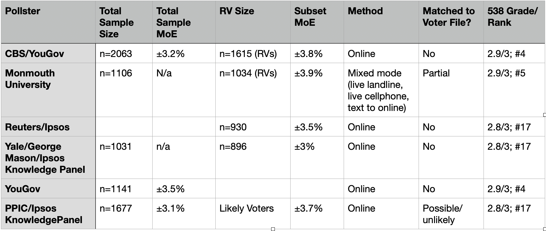 The sample sizes vary from as few as 896 respondents to 2063 respondents; they might include registered voters or likely voters; they might be California only; they might be online only or mixed mode; they might offer a Spanish language version or not; they might match to voter file or compare to it; they might have to do a lot of weighting or a little to make the sample representative. But the ranges of MoE are ±3-3.9%.