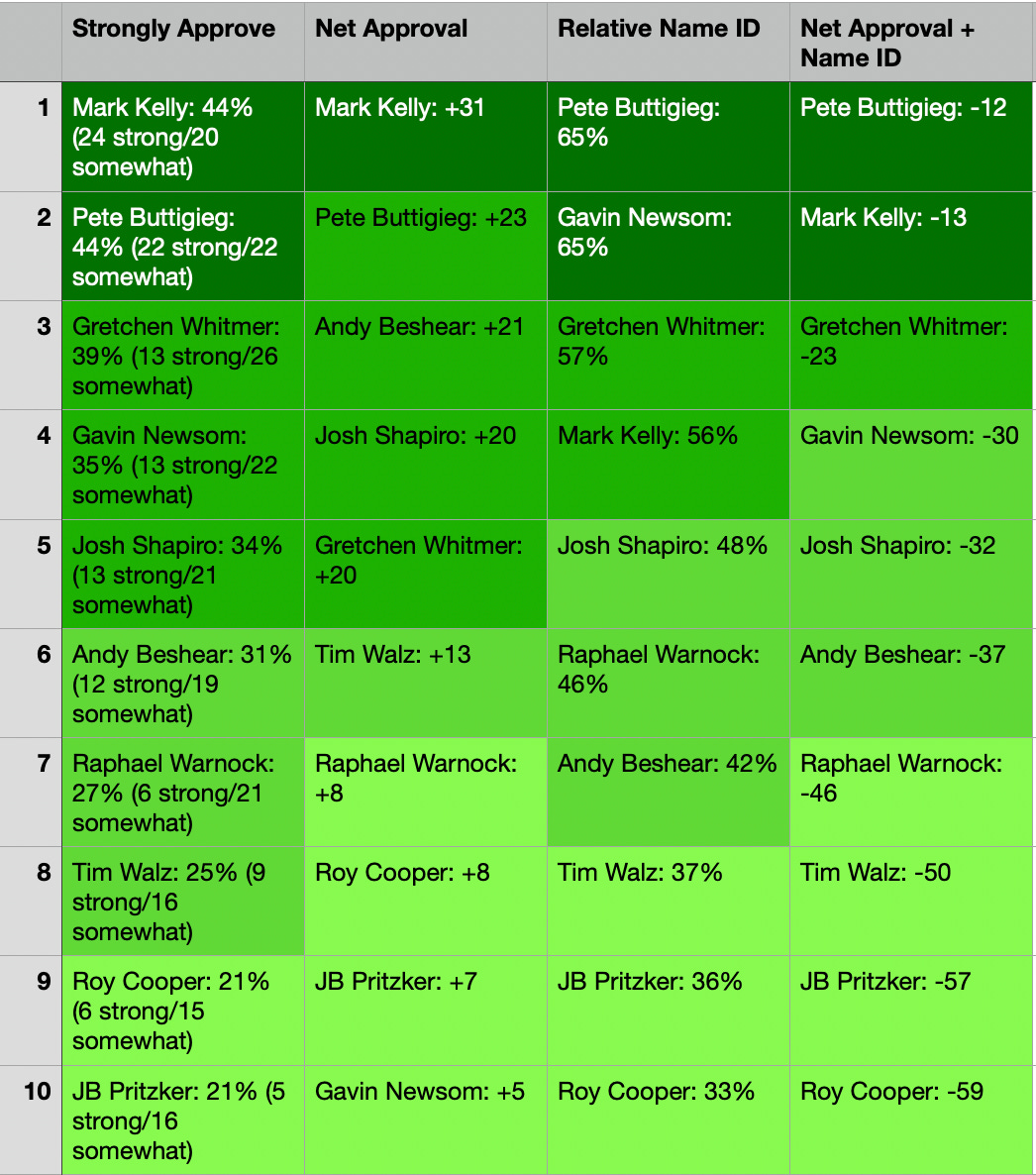 Let’s note how the list is sorted — it’s in descending order based on the “Strongly Approve” number, making Mark Kelly the seemingly best pick, followed by Pete Buttigieg and Josh Shapiro at 4-point intervals.