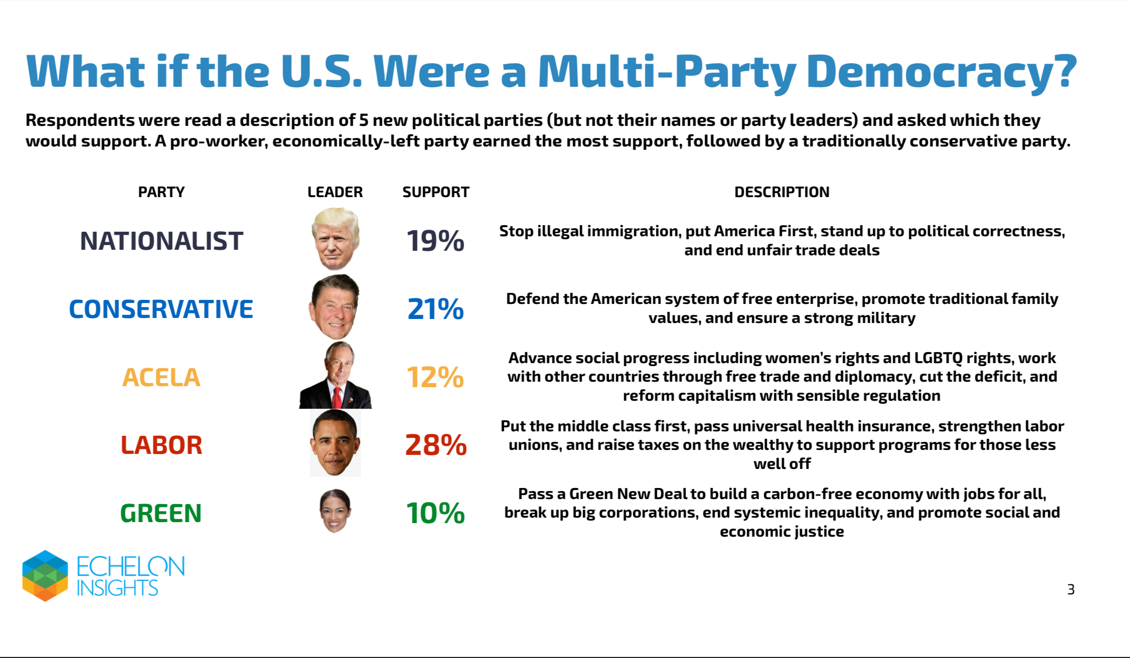 Now, those who identify as Republican are still right-wing. In Echelon’s study, 75% of Republican voters chose the right-leaning parties, Conservative and Nationalist (and they were about evenly split between them). Of the remaining parties, the most popular for Republican voters was actually the Labor party, garnering about 11% of the Republican vote.4 We should expect to continue seeing the MAGA-populist candidates do well among Republican voters in primaries, but if a Labor-oriented party could peel away a few of those Labor-inclined Republicans, it would be a game changer for Democrats.
