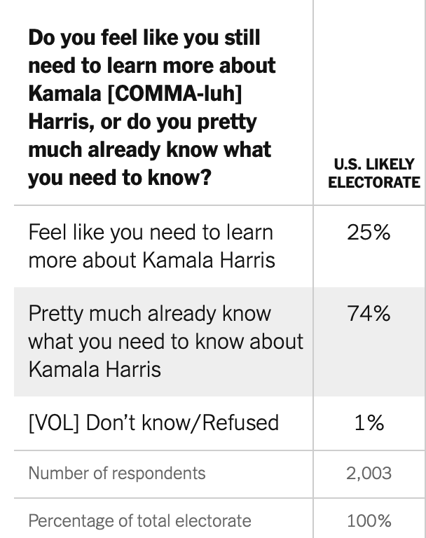 Or this version: “Do you feel like you still need to learn more about Kamala Harris, or do you pretty much already know what you need to know?” from a New York Times/Siena College poll: