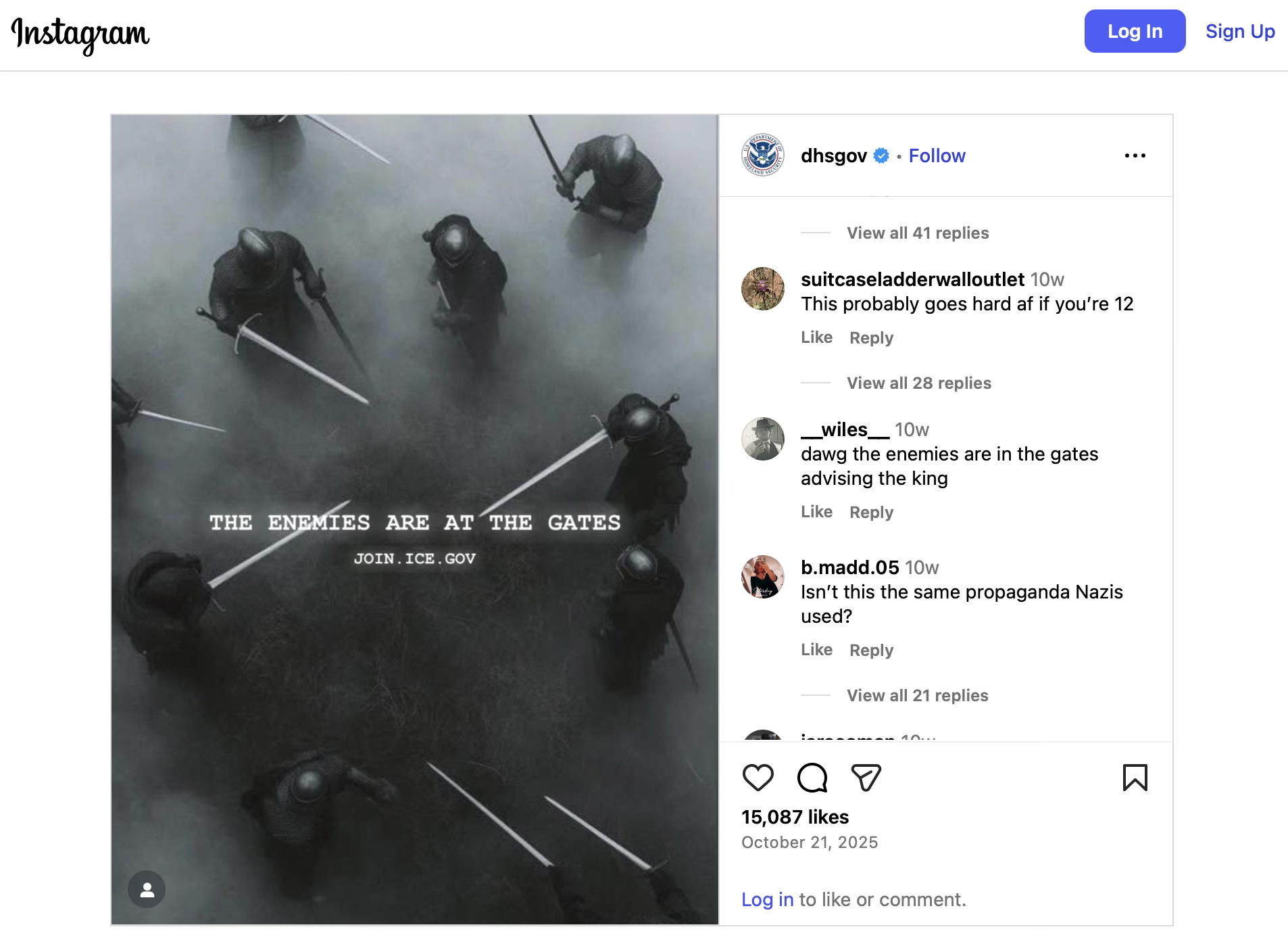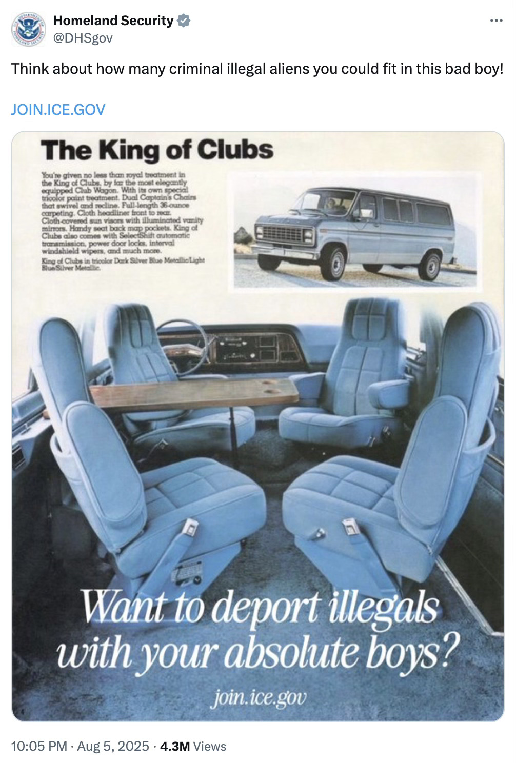 They’re also going straight for borrowed interest methods, as well as trying to reach people when they are most likely to be in a MAGA mindset by allocating “millions of dollars in spending for Snapchat ads, influencers and live streamers on Rumble, a video platform popular with conservatives. Under the strategy, ICE would also use an ad-industry technique known as “geofencing” to send ads to the phone web browsers and social media feeds of anyone who set foot near military bases, NASCAR races, college campuses or gun and trade shows.”