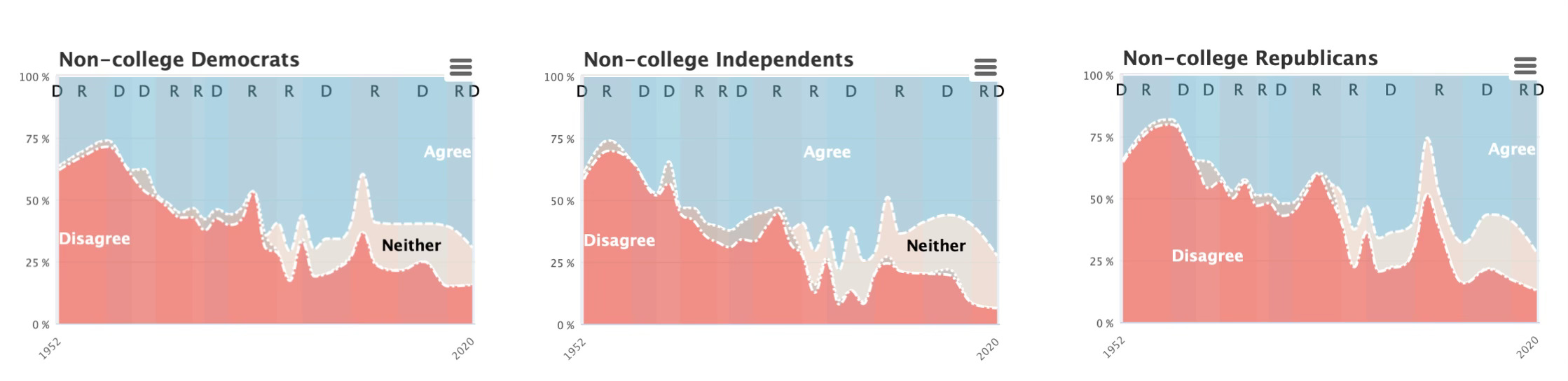 Regardless of your party ID or education level, the sense that people like you have a say has generally declined over the years, but generally more steeply for self-identified Republicans, regardless of education level.