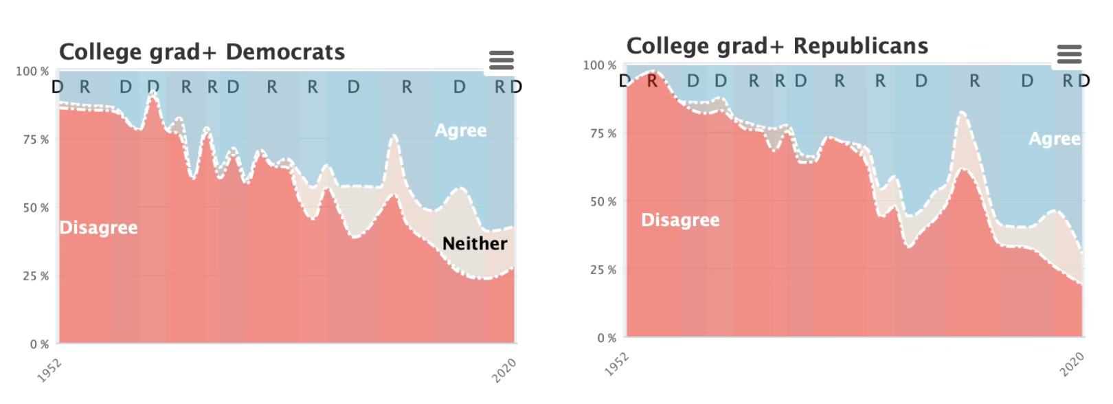 And college+ voters by party ID/lean (data for college grad+ Independents only goes back a few cycles for some reason, so I’ll leave that out for now).