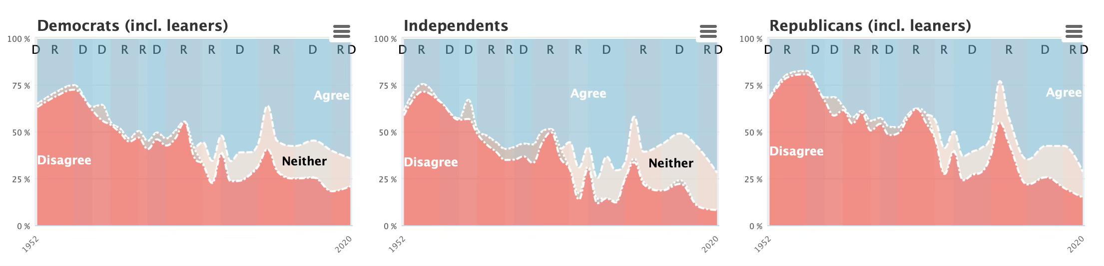 This one’s interesting for a variety of reasons - everybody’s sense of this declines in the 90s, but it really declines for self-identified independents. And while the Democrats slope is a little less steep, it’s because Democrats started out less likely to think public officials cared much what they thought.