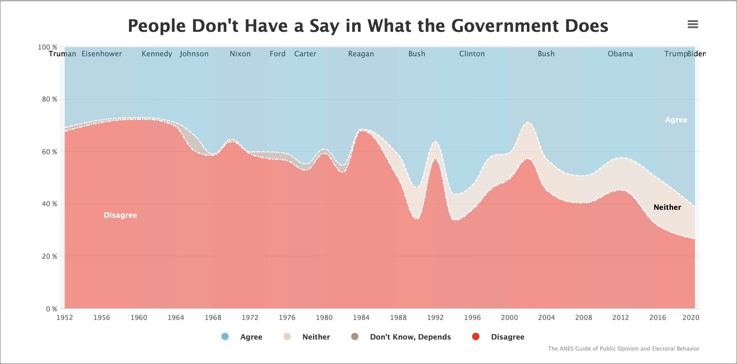 After the 2016 election, I read somewhere that there was an extremely high correlation between agreeing with statements like “people like me don’t have any say about what the government does” or “public officials don’t care much what people like me think” and voting for Donald Trump.