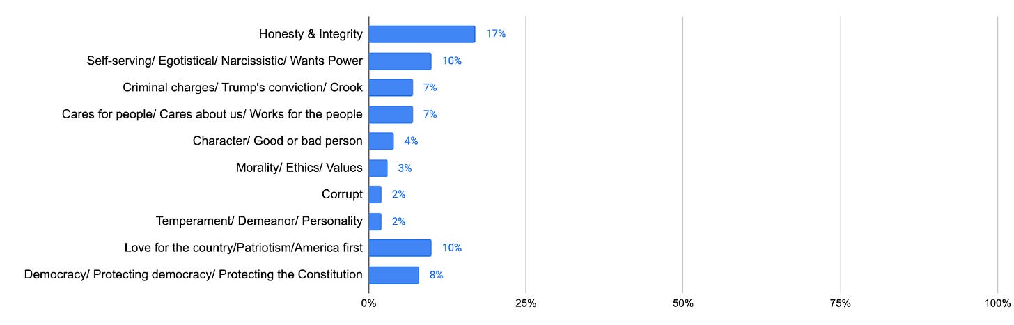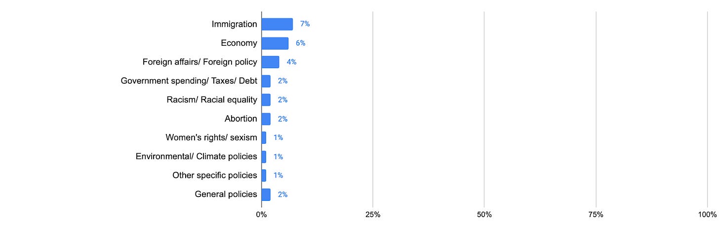 This underplays the differences a bit. The question is open-ended, which means people could say or type whatever they wanted, so the analysts had to “code” the responses by labeling categories of responses in ways that feel descriptive, inclusive, and also distinct. The numbers don’t add up to 100% because people may have cited multiple ideas in their open ends, even though the question is about “the most important” — look, people don’t always follow the instructions.