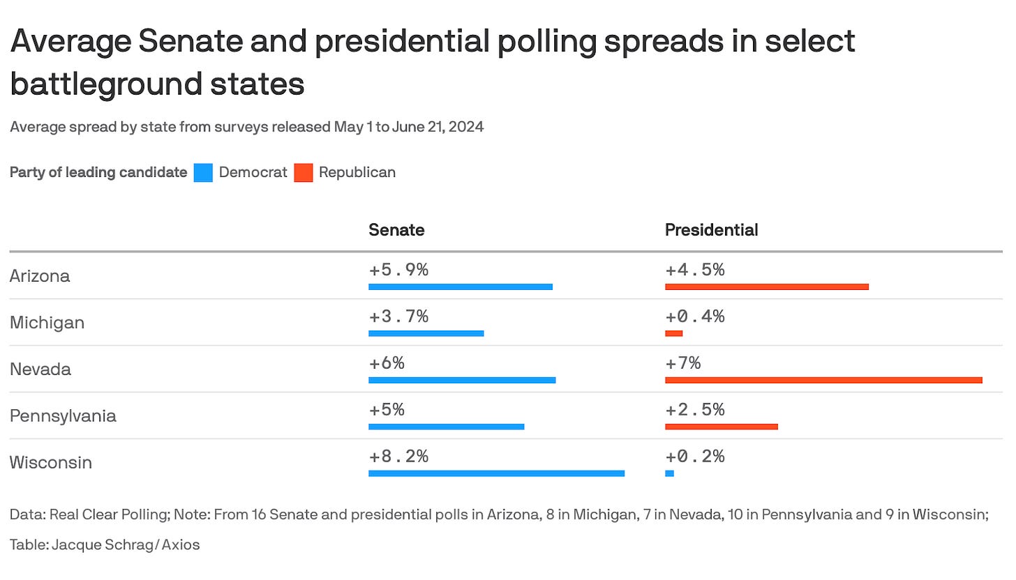 People are reasonably concerned about how Biden’s perceived strength or weakness might affect down-ballot races. However, down-ballot candidates have been performing more strongly than Biden in swing states. In the only post-Debate swing state poll from Bloomberg/Morning Consult (ranked 116th by FiveThirtyEight with a very low transparency score, and a middling score on bias/error), Biden is running behind most senatorial candidates in battlegrounds with Senate contests.
