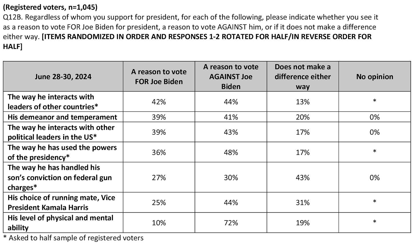 I’ve now read just about every publicly available poll with cross tabs that’s come out since “The Debate” in an attempt to understand if anyone could make a data-driven decision about whether Biden should stay in the race.