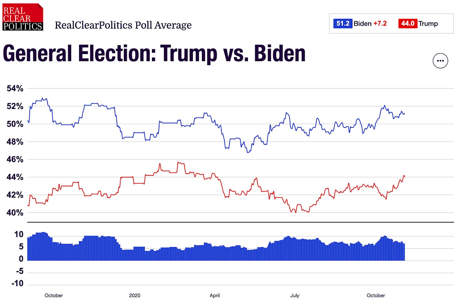In 2016, the RCP average had the race 46.8% Clinton/43.6% Trump but the result was 48.2% Clinton/46.1% Trump, underestimating both Clinton and Trump.