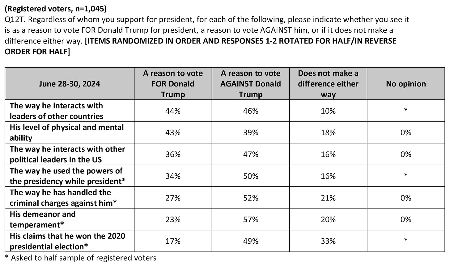 People are less ambivalent about Trump; 57% say “his demeanor and temperament” are a reason to vote against him; 52% say it's “the way he has handled the criminal charges against him”; 50% say it's “the way he used the powers of the presidency while president”; 49% say it's “his claims that he won the 2020 presidential election” (33% say that doesn't make a difference).