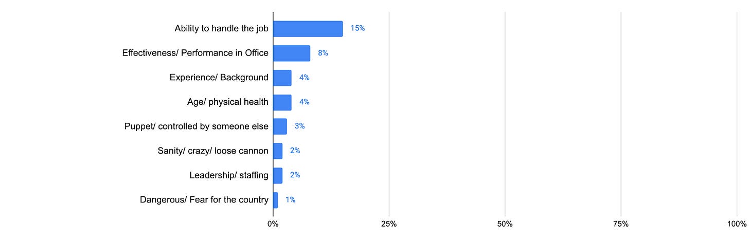 - 36% strongly or somewhat agreed that Biden was just too old to be an effective president. 18% of Democrats agreed.